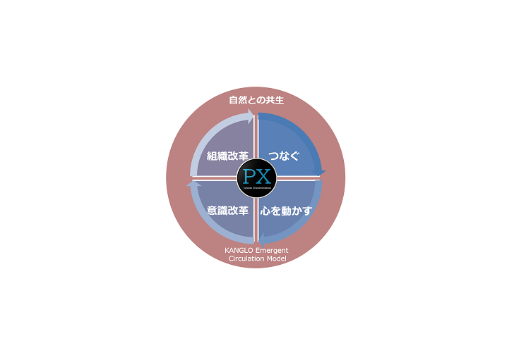 私たちは、PX(Purpose Transformation:存在意義による変革)を中心核とし、自然との共生を図りながら、人、チーム、組織を「つなぎ」、感動や情熱により「心を動かし」、人々の「意識変革」、そして「組織改革」へと独自のファシリテイティングにより導きます。私たちは、この創発循環モデルをドライバーとして、上記3つを実現し、社会変革を起こします。それが、カングロの存在意義(パーパス)です。