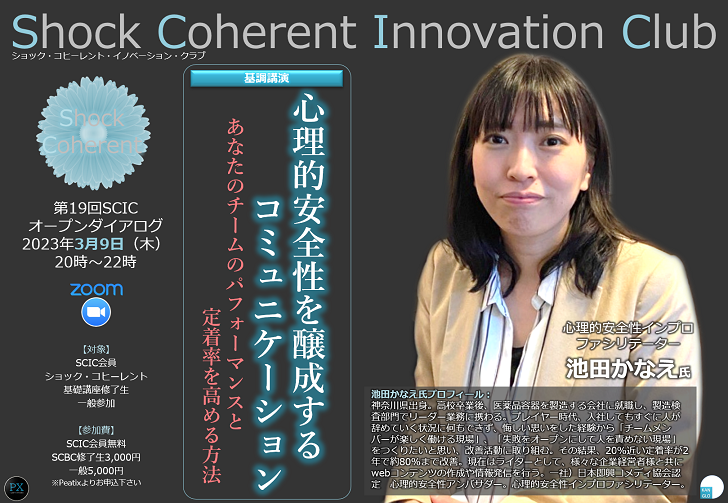 「心理的安全性を醸成するコミュニケーション~あなたのチームのパフォーマンスと定着率を高める方法」第19回Shock Coherent Innovation Club(SCIC)オープン・ダイアログ/講演者:池田かなえ氏 〔2023年3月9日(木)20時~〕