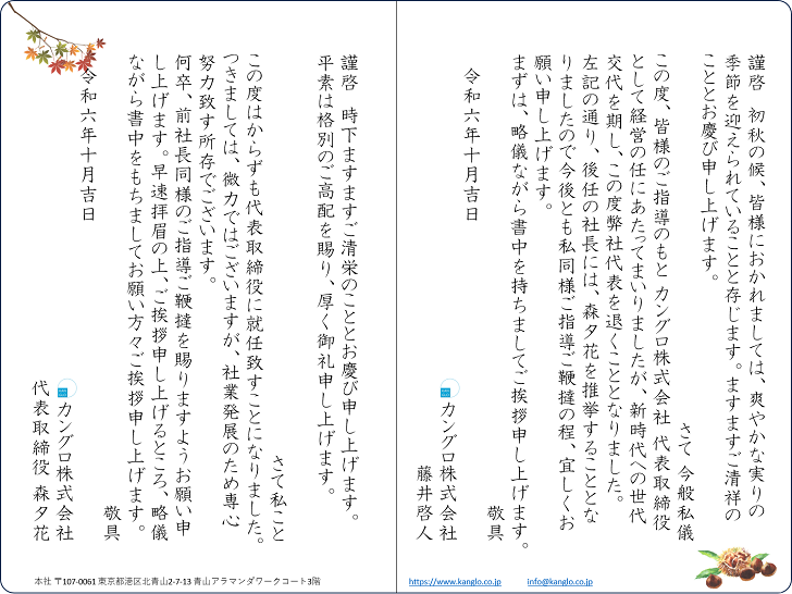 何卒、前社長同様のご指導ご鞭撻を賜りますようお願い申し上げます。早速拝眉の上、ご挨拶申し上げるところ、略儀ながら書中をもちましてお願い方々ご挨拶申し上げます。